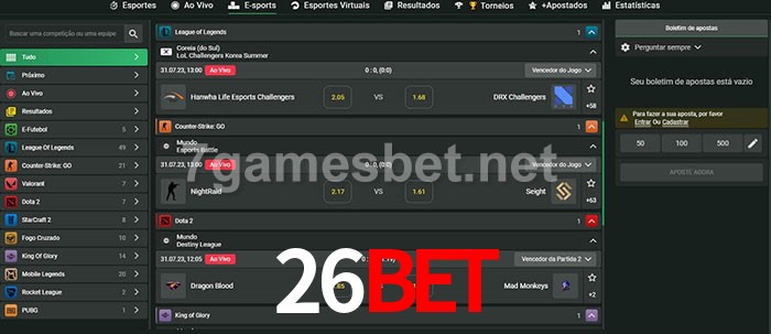 O 26Bet oferece uma grande seleção de opções de apostas em e-sports com probabilidades competitivas